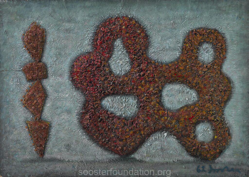 Unfortunately, Sooster did not have much chance to develop his artistic ideas and career after graduating. Soon after moving from Tallinn in search of a job, he and a group of co-students and friends from Tartu were accused of anti-Soviet activities, so he spent the years 1949–1955 in labour camps in Kazakhstan.1 After being released, the fact that he had been a political prisoner was a serious obstacle in publicly re-establishing himself as an artist in Estonia. Having married Lidia Serkh, whom he had met in the labour camp complex, Sooster left for his wife’s hometown of Moscow, and it was there that he became the artist we know today. There, his creative ideas developed in a fruitful environment, in an alternative community of artists, writers, musicians, researchers in humanities and scientists – whom Lidia Sooster has described as the creators of a true cultural revolution. However, the inner freedom of this circle was in stark contrast to the severely restricted official art, controlled by the Artists’ Union officials. Khruschev’s Thaw wasn’t as mild as one might imagine. The way the intelligentsia’s hopes were crushed is perfectly exemplified by the notorious conflict between the Soviet Communist Party leader and the non-conformist artists of Sooster’s circle (Ernst Neizvestnyi, Vladimir Yankilevsky, Yuri Sobolev, Ely Bielutin and members of his studio, etc.) at the exhibition 30 Years of the Moscow Artists’ Union at the Manege in 1962.