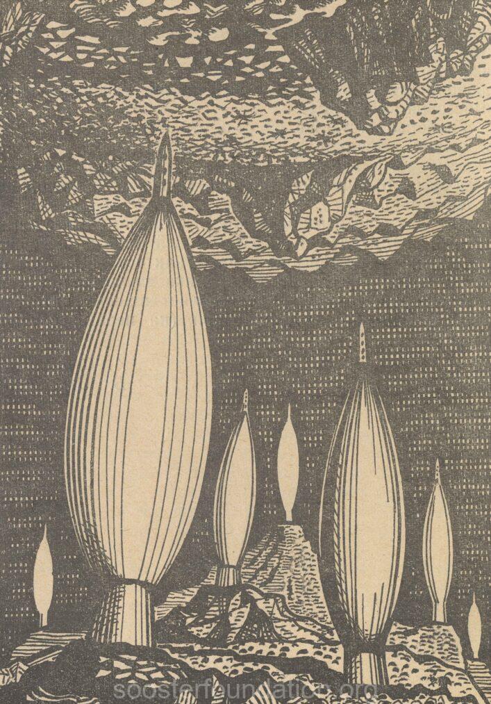 Sooster’s hybridity extends to the artistic media he worked in; for example, book illustration was not only his main way of earning a living, but also, to a degree, a platform for experimenting with new ideas. Unlike his paintings and drawings, books illustrated by him enjoyed a much wider audience during his lifetime, as Soviet publishing culture included enormous print runs. Good examples are Sooster’s illustrations for popular science books and articles,6 as well as for science-fiction – both spheres where processes that are often unreachable to the human eye were discussed, making it possible to explore ingenious surreal or abstract images, which would have met more severe criticism in the format of exhibition art. Unlike Moscow conceptualists, like Kabakov or Viktor Pivovarov, who incorporated the school-bookish visual language of Soviet children’s literature ironically into their artworks, Sooster had a more emphatic attitude, where fascinating dialogues between artistic and non-artistic imagery could be seen. On the one hand, he transferred elements from his scientific and science-fiction illustrations into his paintings and drawings, thus enriching the vocabulary of the visual art of the time. On the other hand, he used structures or atmospheres of historical and modernist artworks to visualise processes described in research papers by particle physicists or in fantastic literary narratives. Thanks to his book illustrations, Sooster’s ideas circulated in the wider literary and visual culture.