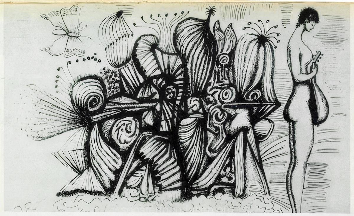 Woman with a musical instrument and an abstract object. 1965-7. Ink, paper. 18 x 26 cm