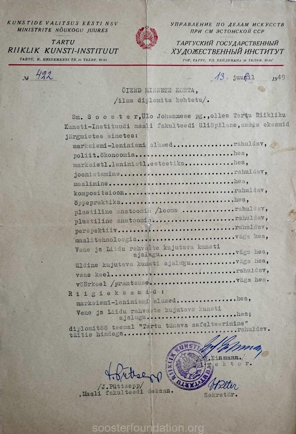 1948. aastal kiitis komisjon heaks Ülo Soosteri lõputöö teema, juhendajaks määrati professor Elmar Kits.