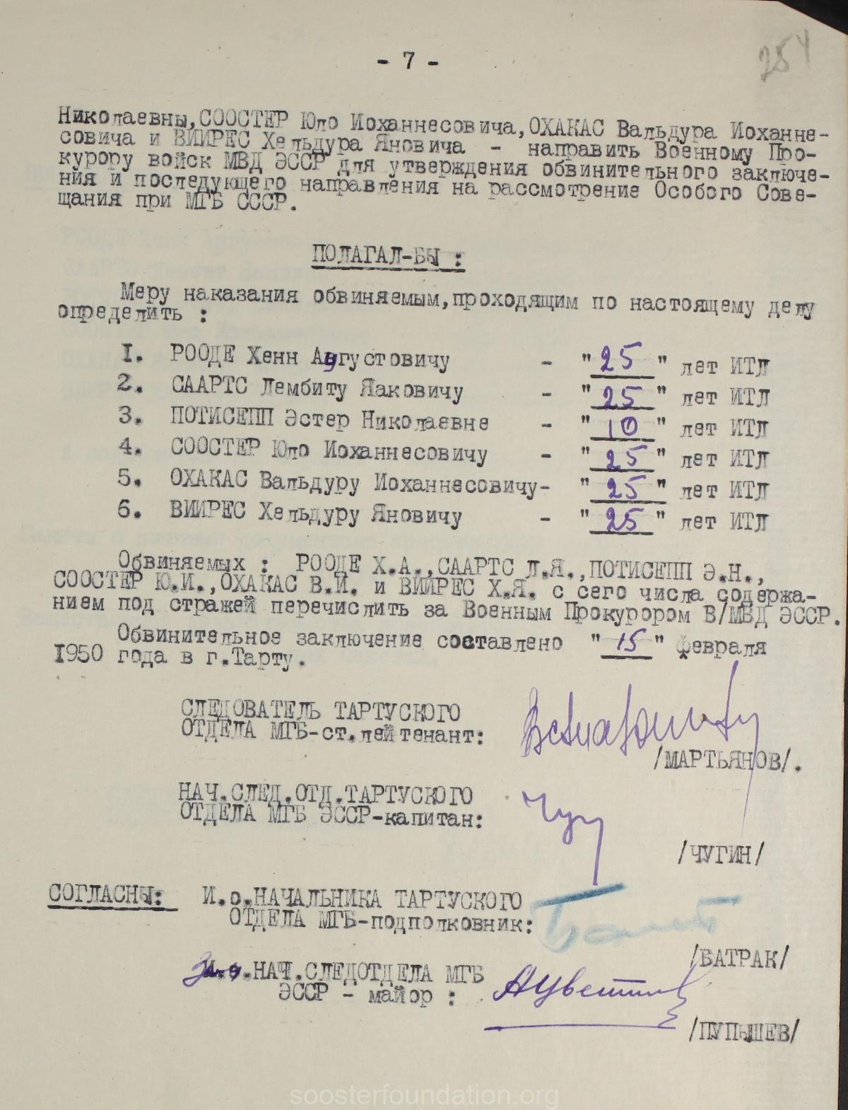 15. veebruaril 1950 koostati Tartus süüdistus Vene NFSV karistusseadustiku paragrahvi 58-1a (kodumaa reetmine) ja 58-11 (kontrrevolutsiooniline tegevus) alusel, mille kohaselt sai Esther Potisepp 10 aastat, Ülo Sooster ja teised noored kunstnikud aga 25 aastat parandustöölaagrites.
